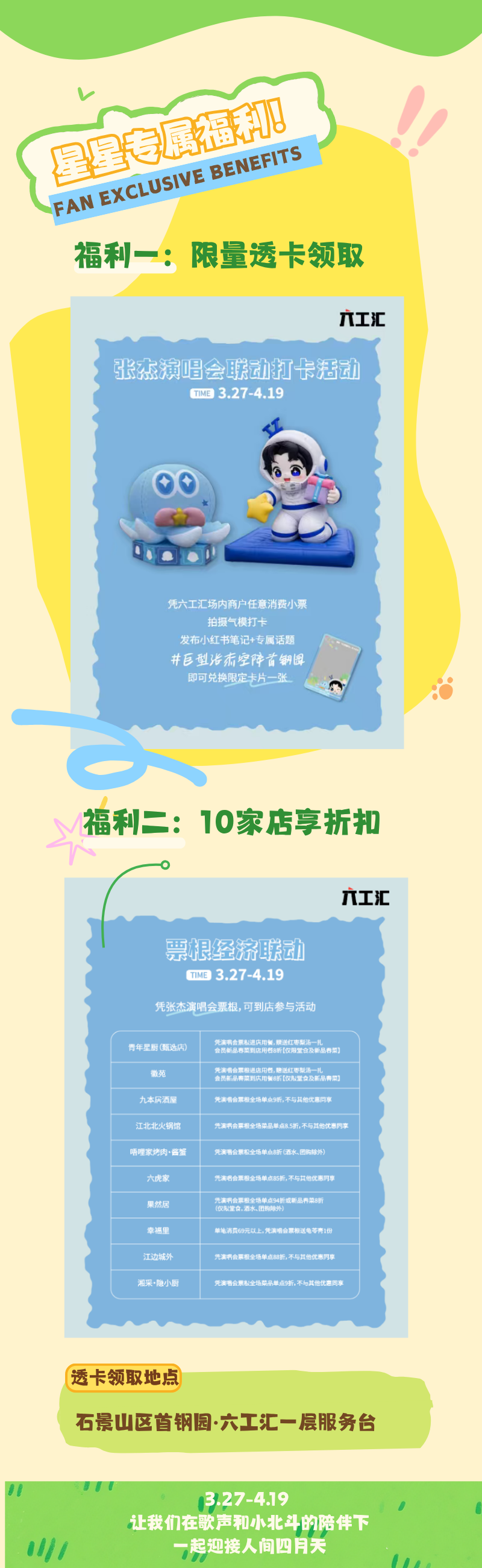 即日起-4.26期间,在湾里任意消费,即可在湾里·汀云小镇顾客服务中心或湾里·王府井WellTown L1服务台领取张杰北京演唱会限定小北斗透卡。