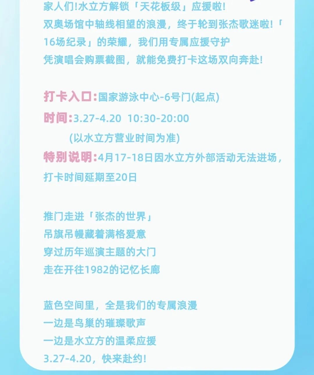 活动期内(3.27-4.20,除4.17-4.18)凭张杰鸟巢演唱会门票,均可进入水立方打卡(不限日期),可错峰前来。
