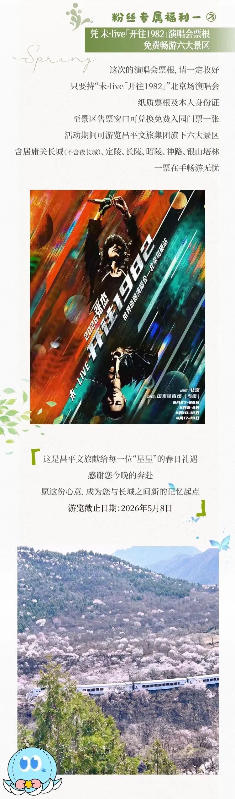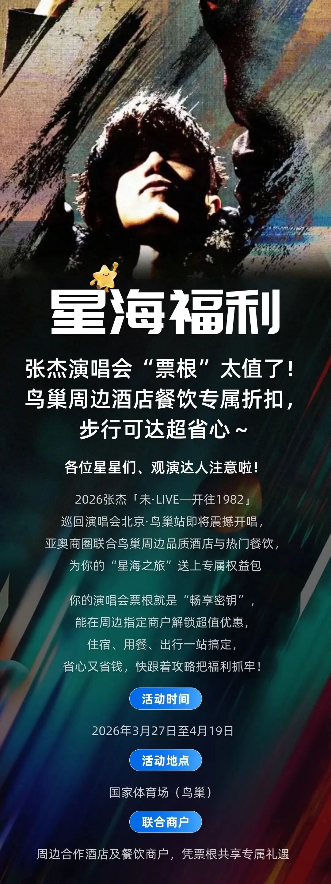 3月27日至4月19日2026张杰未·LIVE—「开往1982」演唱会在国家体育场(鸟巢)连开16场,“跟着张杰演唱会打卡北京”第二波宠粉福利来袭。