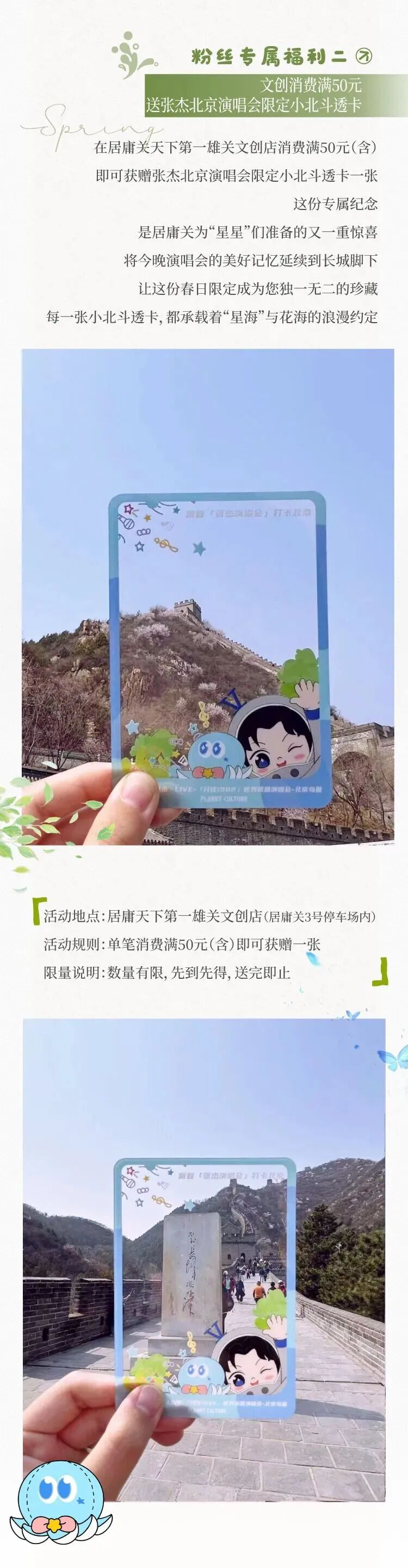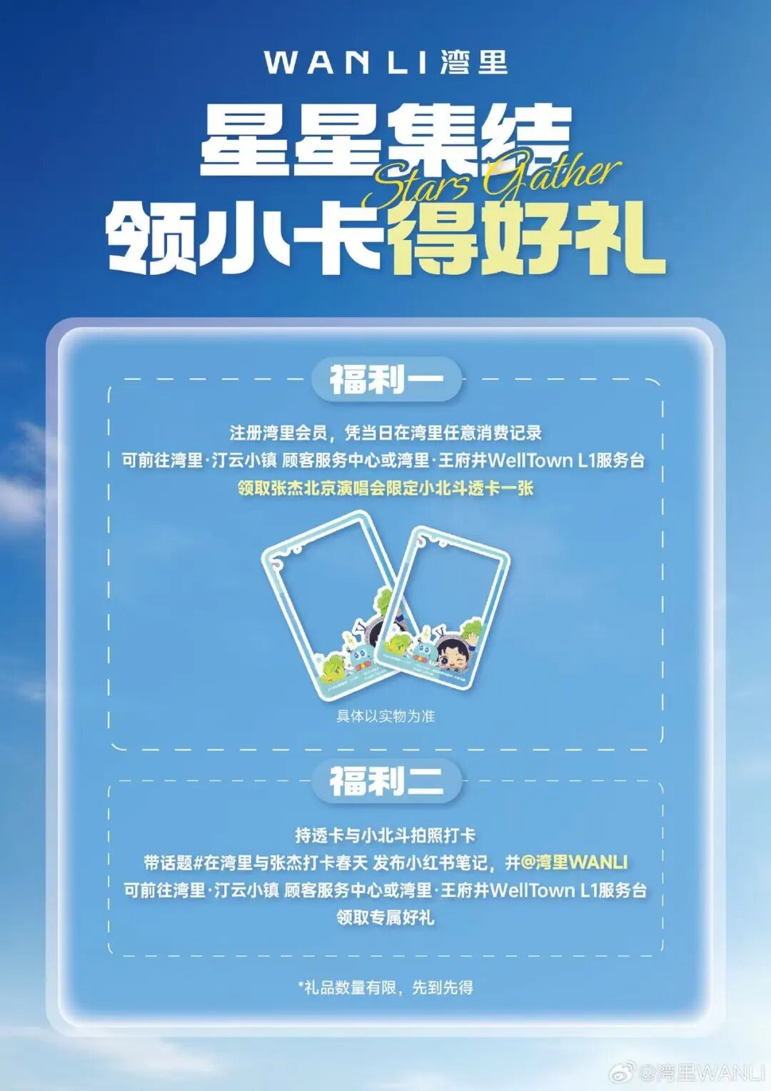 持透卡与小北斗拍照打卡,并发布小红书原创笔记+话题#在湾里与张杰打卡春天# 、#跟着张杰演唱会打卡北京# ,@湾里WANLI官方小红书账号还可前往湾里·汀云小镇 顾客服务中心或湾里·王府井WellTown L1服务台领取湾里准备的心动好礼。