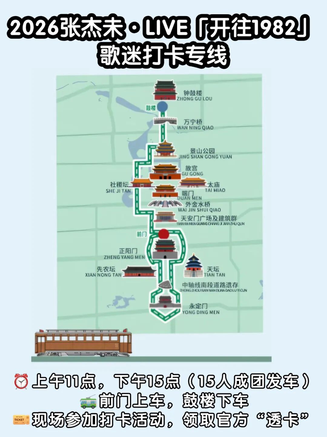 欢迎大家来北京参加张杰演唱会~坐着铛铛车一起打卡北京中轴线,共唱金色的屋檐。