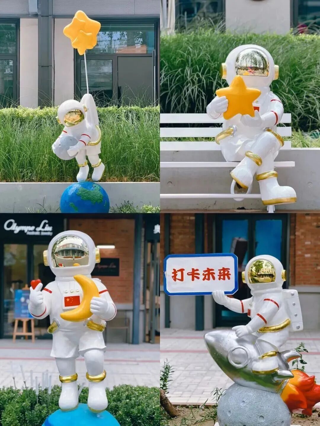 夜幕降临,霓虹灯勾勒出科技感十足的园区轮廓,随处可见的宇航员和卫星元素,伴着晚风与落日余晖,夜游园区别有一番意境。