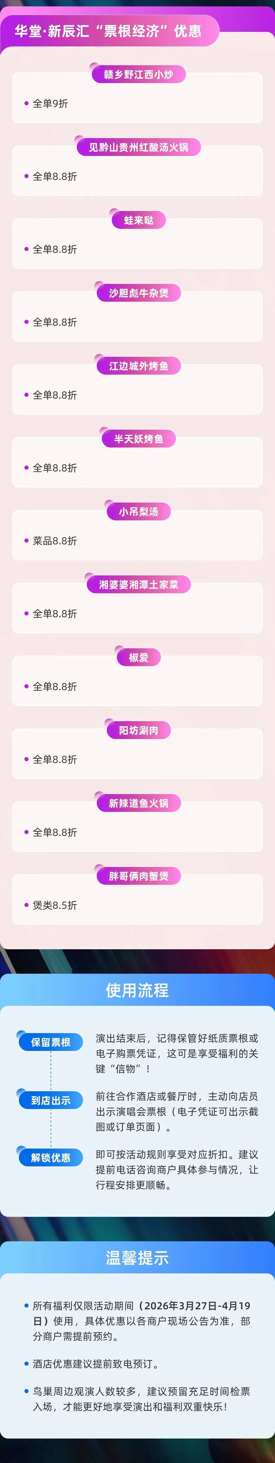 🌟温馨提示:请随时关注景区、商区官方帐号最新发布信息,获取“持票根享优惠活动”详情。由于天气变化等原因,活动可能延期或取消,为不耽误您的行程,建议您出行前与景区、商区沟通以获得最新情况~预祝您旅途愉快!