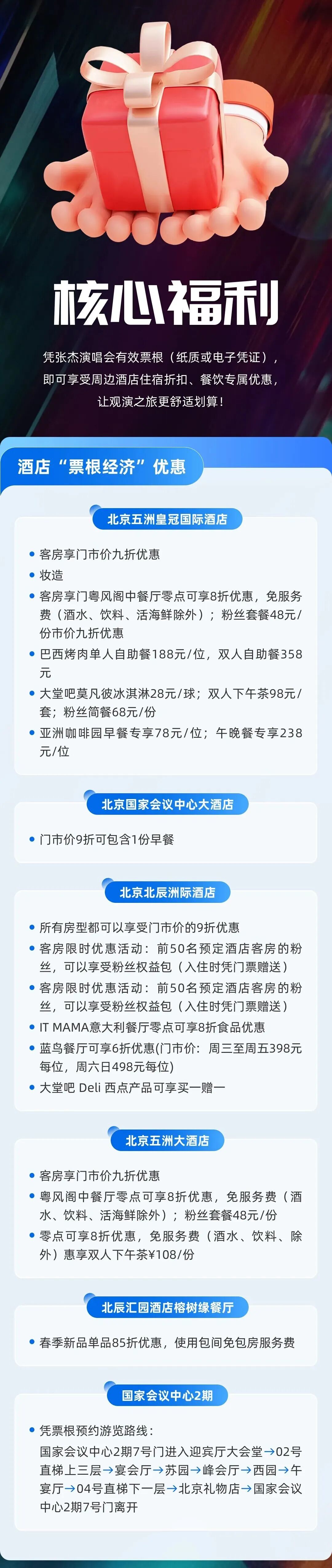 以票换票:游客凭演唱会门票或订单并携带本人身份证,可免费兑换潭柘寺景区、戒台寺景区或妙峰山景区任意门票一张;专属小卡:关注景区公众号即可领取限量透卡一张,领取地点:潭柘寺景区、戒台寺景区游客中心,妙峰山景区喜神咖啡厅。