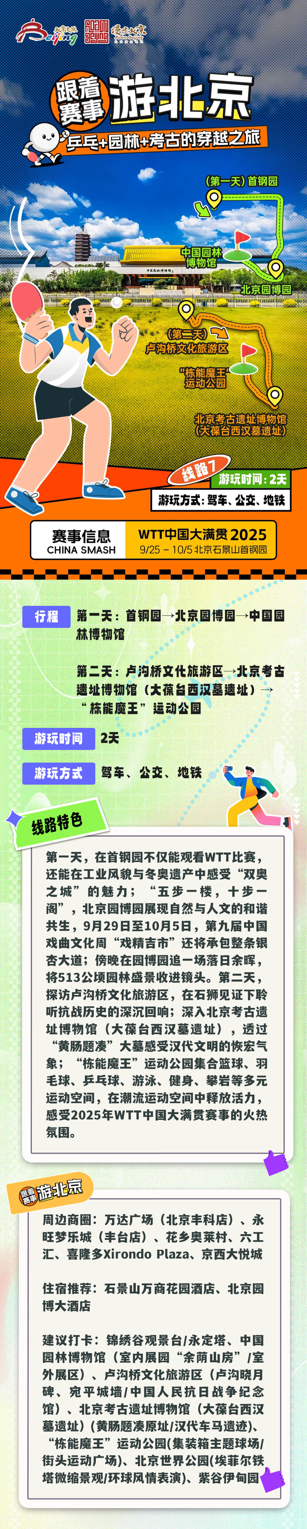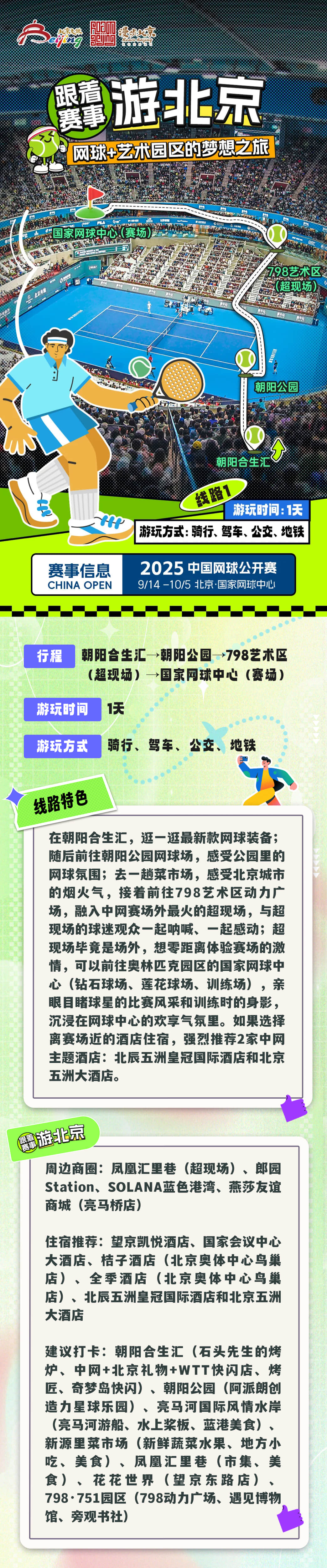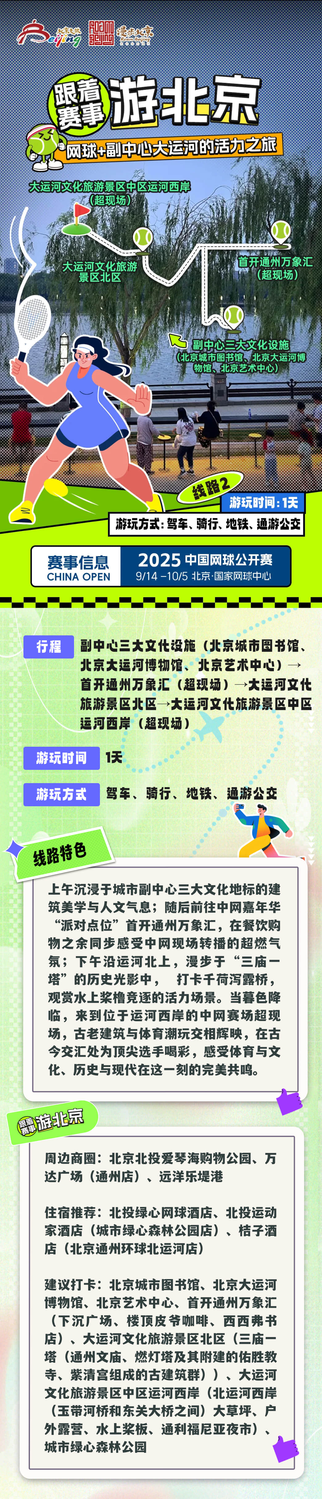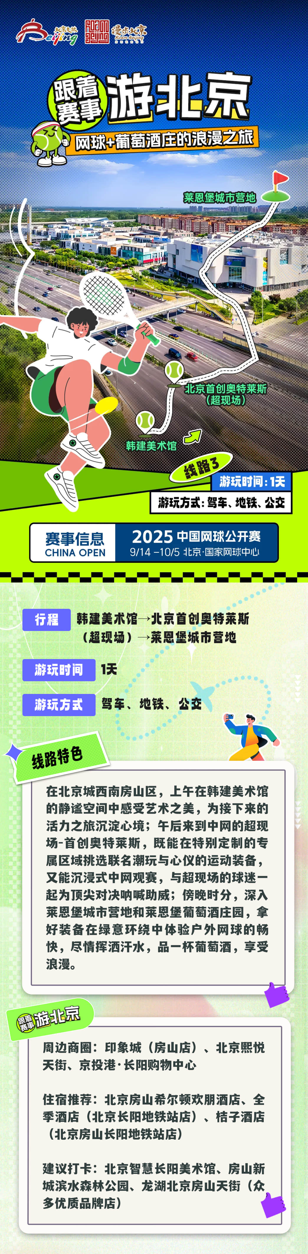 秋天是北京最美的季节,也是北京大型国际赛事集中的日子。这不,临近国庆中秋,2025中国网球公开赛挥拍了,WTT世界乒乓球大满贯赛来了,国际滑联花样滑冰资格赛也开始了。来京游客、市民朋友们,在北京就能亲自体验一下几大赛事的热火朝天,亲身感受体育比赛的无穷魅力,实地领略北京文旅资源的丰富多样,用心触摸北京这座城市的温度与友好……北京市文化和旅游局结合赛事,精心推出了10条“跟着赛事游北京”线路,请跟我来!