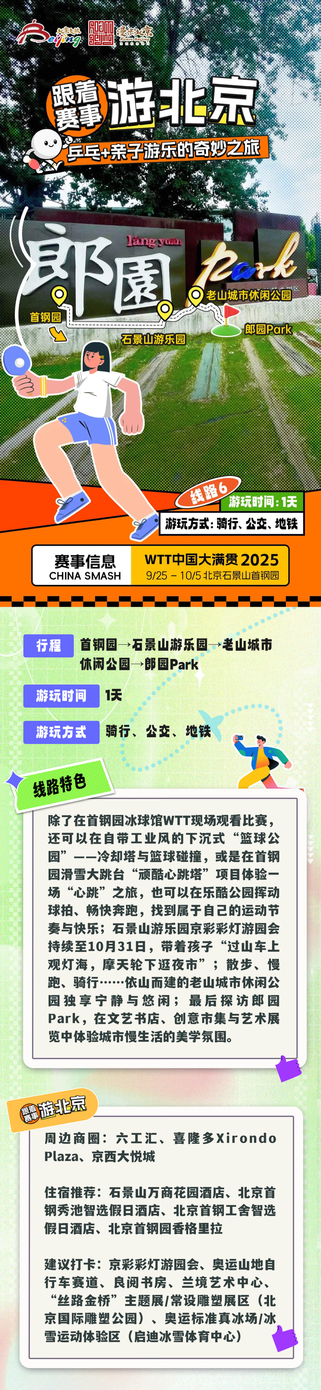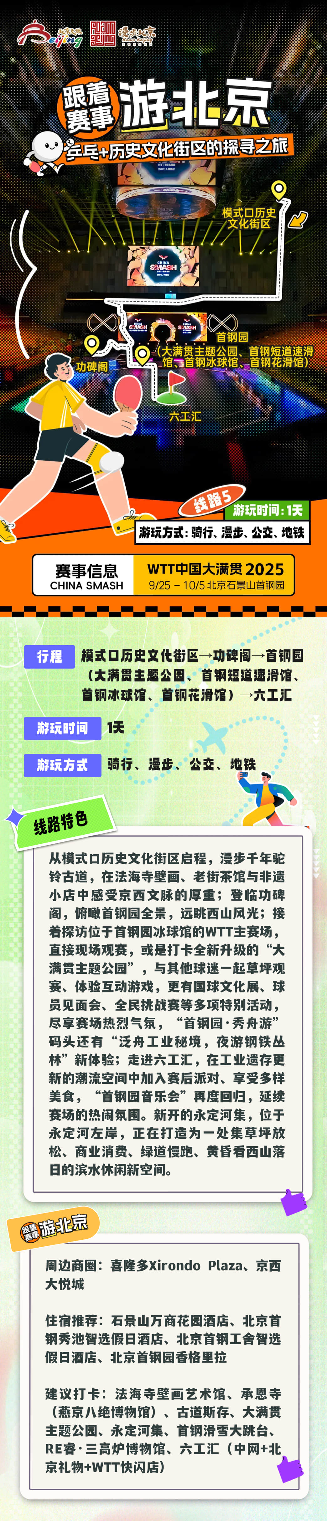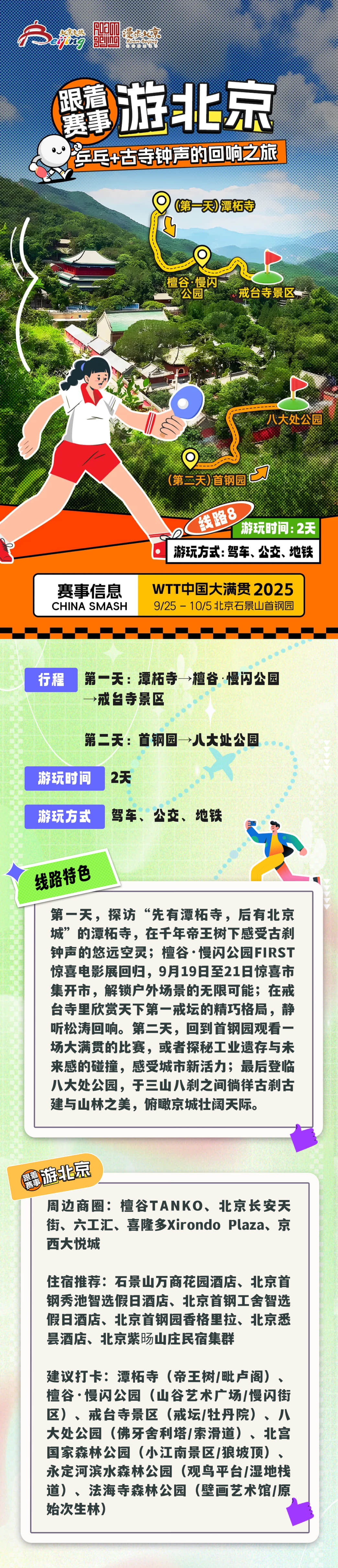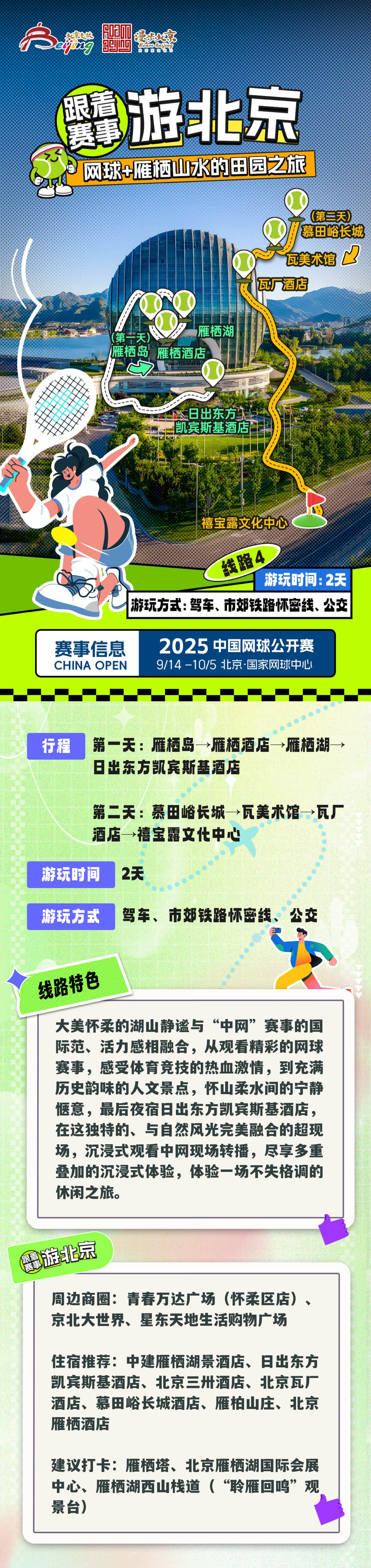 秋天是北京最美的季节,也是北京大型国际赛事集中的日子。这不,临近国庆中秋,2025中国网球公开赛挥拍了,WTT世界乒乓球大满贯赛来了,国际滑联花样滑冰资格赛也开始了。来京游客、市民朋友们,在北京就能亲自体验一下几大赛事的热火朝天,亲身感受体育比赛的无穷魅力,实地领略北京文旅资源的丰富多样,用心触摸北京这座城市的温度与友好……北京市文化和旅游局结合赛事,精心推出了10条“跟着赛事游北京”线路,请跟我来!