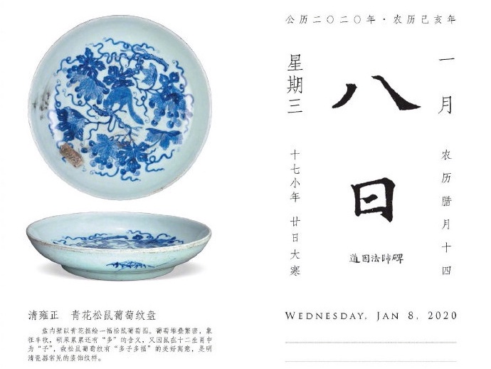 清雍正,青花松鼠葡萄纹盘。盘内壁以青花描绘一幅松鼠葡萄图。葡萄堆叠繁密,象征丰收,硕果累累还有“多”的含义,又因鼠在十二生肖中为“子”,故松鼠葡萄纹有“多子多福”的美好寓意,是明清瓷器常见的装饰纹样。