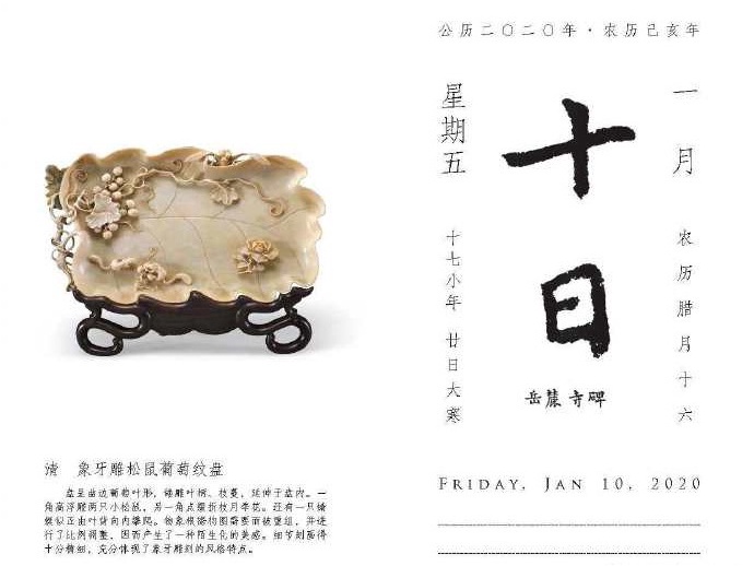 清,象牙雕松鼠葡萄纹盘。盘呈曲边葡萄叶形,镂雕叶柄、枝蔓,延伸于盘内。一角高浮雕两只小松鼠,另一角点缀折枝月季花。还有一只蜻蜓似正由叶背向内攀爬。物象根据构图需要而被重组,并进行了比例调整,因而产生了一种陌生化的美感。细节刻画得十分精细,充分体现了象牙雕刻的风格特点。