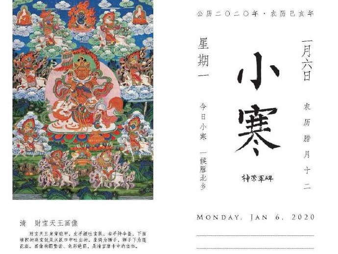 清,财宝天王画像。财宝天王身穿铠甲,左手握吐宝鼠,右手持伞盖,下面堆积的珠宝就是从鼠口中吐出的。坐骑为狮子,狮子下为莲花座。画像构图繁密、色彩艳丽,是清宫唐卡中的佳作。