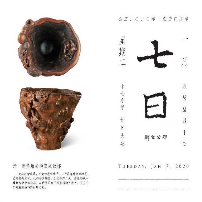 清,犀角雕松树双鼠纹杯。此杯杯壁较厚,外壁如老松枝干,口内高浮雕两只松鼠,首尾相衔成环。此杯磨工颇佳,加之年深日久,外壁形成一 种如脂膏般的质感,与内壁的鱼子纹肌理相互映衬,突显出犀角雕刻独特的材质之美。