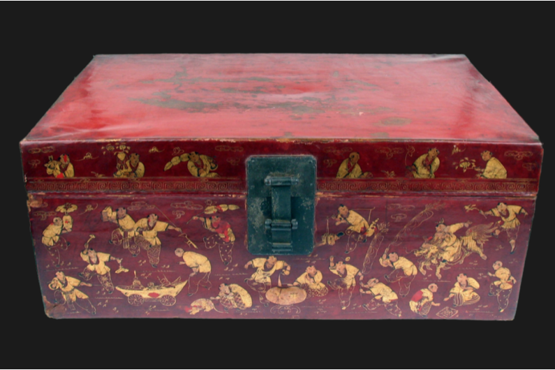 百子图皮箱为清代时期的竹木漆器,长71.3厘米,宽47厘米,高29.3厘米。百子图皮箱为一对,红底描金,上绘百子图案,寓意子孙众多。