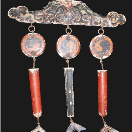 香蜡铺幌子为清代时期的竹木漆器,长65厘米,宽60厘米。招幌共分为四层,由铁制挂环连接,幌盖为覆荷叶形;第二层为太极形,象征阴阳两界;第三层为蜡烛形,整个幌体象征蜡烛能照明阴阳两界;幌坠为磬形,象征吉庆有余。观察四层下部幌挂,应该有第五层,应是鱼形幌坠或红绸幌坠。
