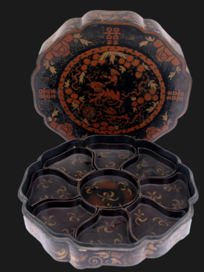 狮子滚绣球喜字纹食盒为清代时期的竹木漆器,直径40.7厘米,高12.5厘米。食盒为葵瓣式,内分九格,中间圆形,周围八件小盒随盒形制作,盒盖上有囍字纹、牡丹花、松鼠葡萄、太师少师纹样,盒子侧面有瓜瓞连绵图。