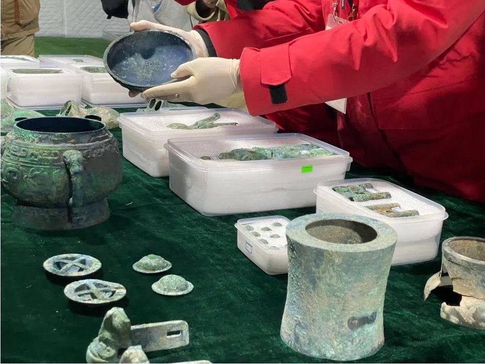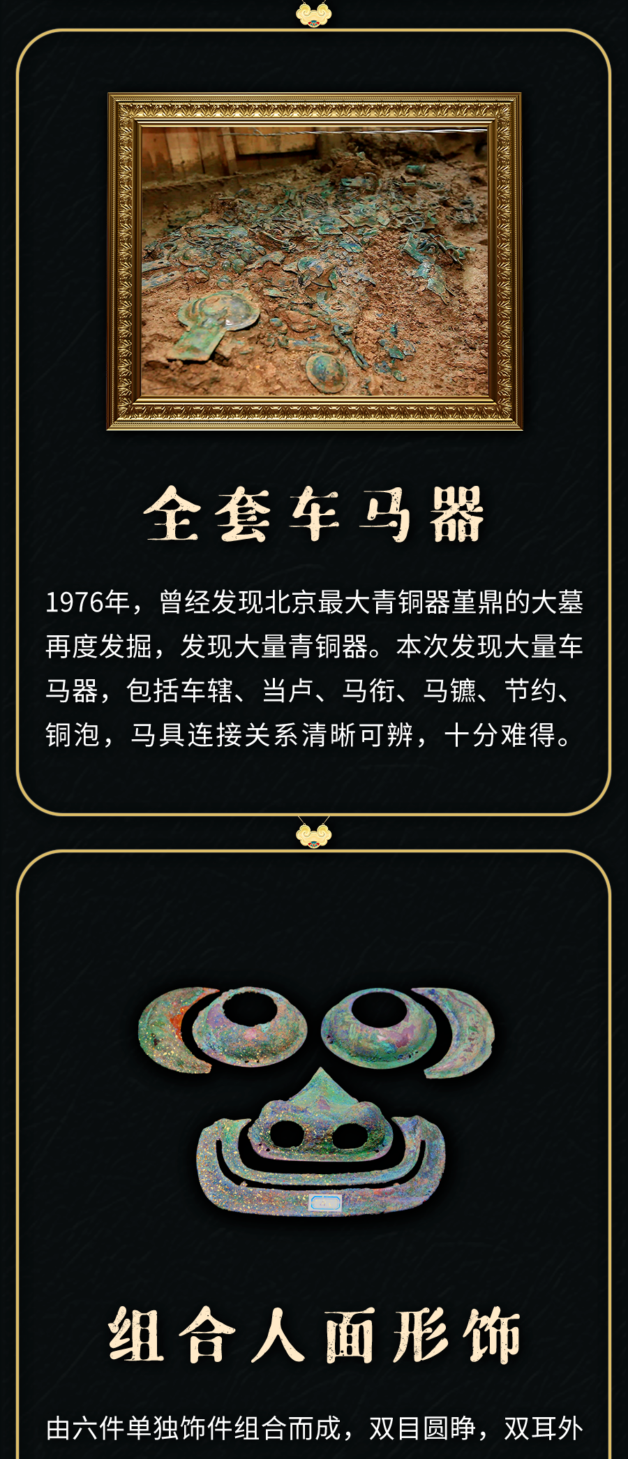 近日,房山琉璃河遗址还出土了刻有铭文的铜簋,其出土进一步证实了西周的名、字制度。新出土的青铜面具、兽面形铜饰、成组的铜车马器、镂空有銎铜戈,纹饰精美、细节丰富,也呈现出多元的文化因素。