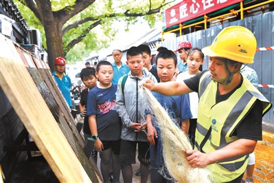 北青报记者发现,这个门楼上多个老部件被保留了下来,包括老门板、雀替、门簪、门墩等等,墙面也已经被修复完整。杜永辉说,这门楼墙面上原来贴了红砖,这红砖是后来人为贴上的,不属于古建的一部分,我们花了大量的时间把红砖一块块剔除,露出原来的老砖,然后再选用青灰色的丝缝砖,在外侧一层层垒起来,每垒一层就要用青灰浆灌浆三遍,灌好之后再打磨。“每做完一个步骤我们就拍照片视频发给设计师,让设计师帮忙把关。”光是修复这一个门楼,三名技工花了一个月的时间。在现场,为了让大家更清晰地认识这些工序,现场工人师傅带领着大家一起从头到尾演示和操作了一番。