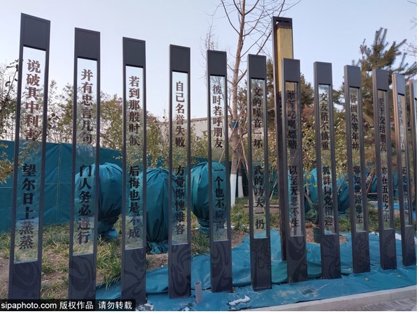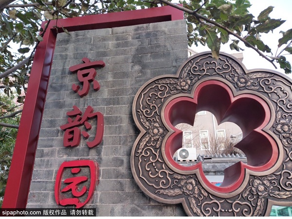 京韵园的设计中增添了不少京剧元素,在亭台对面,一条条长长的走廊前,京剧脸谱装饰的中间,几位京剧名家的照片与生平事迹一一呈现。园子里的景观小品、石刻、院墙,全点缀着京剧文化元素,光拿眼瞧着,就能感觉到一股浓浓的京腔京韵。