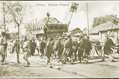 过去,殡葬仪式的繁复程度可以和婚礼媲美,这些繁琐的仪式非常容易吸引外国人的目光。视频中能看到三组不同身份人的出殡,有两组是16人的小杠,有一组32人的大杠。清代,使用多少杠夫抬棺是有等级限制的,普通人家通常8人、12人、16人,官员可以使用32人、48人、64人,只有皇帝才能使用108人的最高规格。出殡时,前面是打着招魂幡的逝者直系亲属,后面有抬着伞盖的,也有鼓乐等仪仗人员。杠夫都是一水儿的绿色或蓝色号衣,头戴红缨帽,单手叉腰,喊着号子前行。