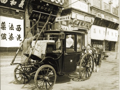 我们可以看到清末的街道繁华,交通工具也丰富,既有传统的轿子、驴车、骆驼,也有刚引进不久的西洋四轮马车和东洋人力车。