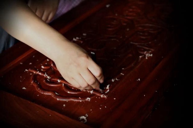 烫蜡是京作非遗的代表性技法,一般可分为:水磨白茬、磨活、烫蜡、擦蜡打光四个步骤;讲究干磨硬亮 即经过数十遍的砂纸、蜡布及锉草等打磨之后,在家具表面形成“包浆亮”的效果。