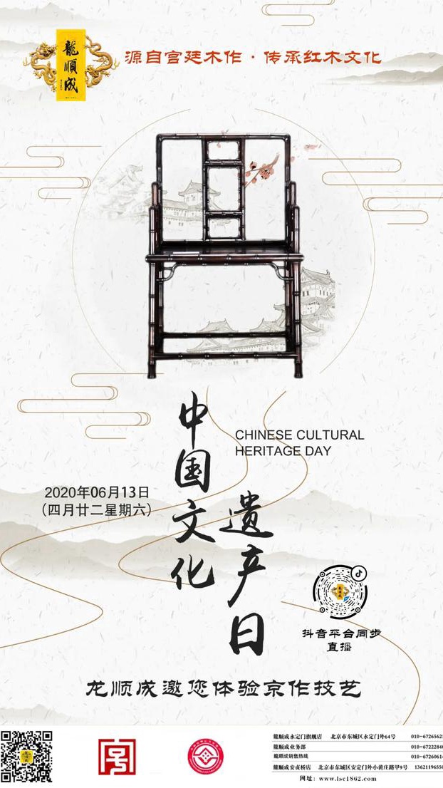 作为京作硬木家具制作技艺的国家级非遗传承单位,龍顺成公司联合“北京珐琅厂、北京象牙雕刻厂、北京玉雕、雕漆、料器、京绣及花丝镶嵌、剧装及押花葫芦”等非遗传承单位,将于6月13日当天开展“非遗日京作非遗技艺现场秀”主题活动。