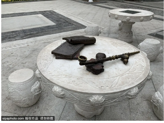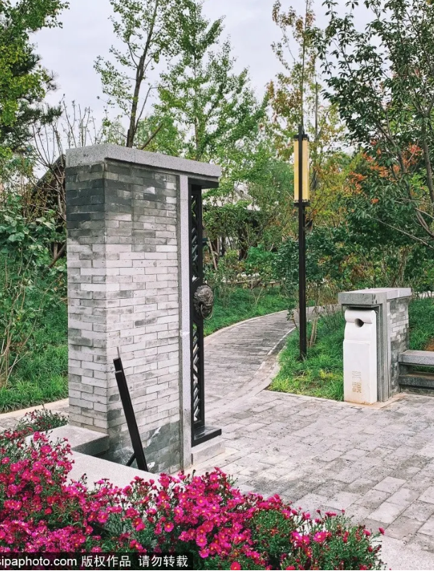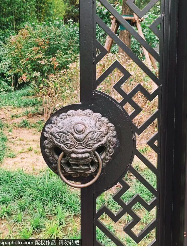古朴的铁质兽面门环、大理石的下马桩恍似推开了大宅门,马连良、言菊朋、梅兰芳等京剧名家的雕像印在紫藤廊架上,将国粹文化巧妙地融入其中~