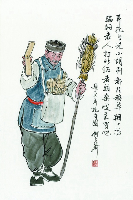他们大都用一根两米多长的木棍,在上面用稻草扎一个有五十厘米长的圆形草扎,把耳挖勺儿、耳绒球(就是小竹签上顶着一个小白绒球,耳内痒的时候,探进去旋转,类似于医用棉签)插在上面,这也是干这行的招幌。老人一般都是手拄着那根招幌长棍,长棍也正好充当了拐杖。