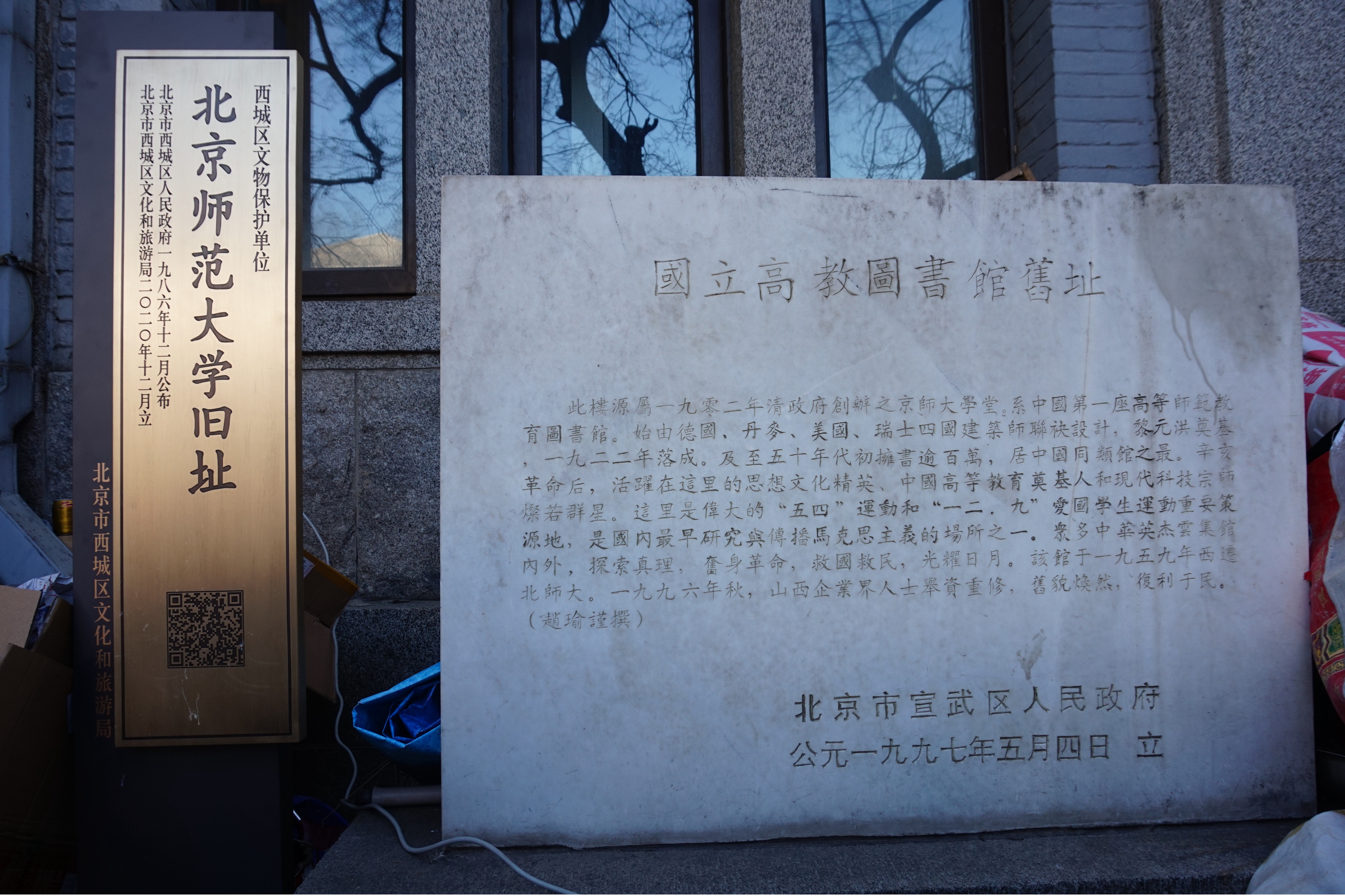 北京第一实验小学校史展览馆旁边有一座北京杏坛美术馆。美术馆楼体的一侧,立有一块石碑,碑文曰:国立高师图书馆旧址。这里,便是北京师范大学的前身——国立北平师范大学的旧址。