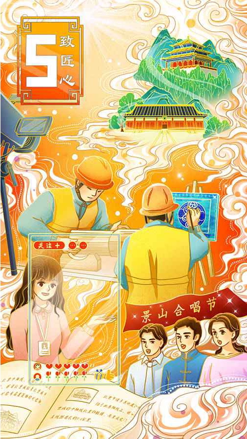 五月赞歌致劳动,合唱齐把匠心诵。景山红莲红五月,演员观众都是群众。匠人技艺云直播,且看中轴修文物。