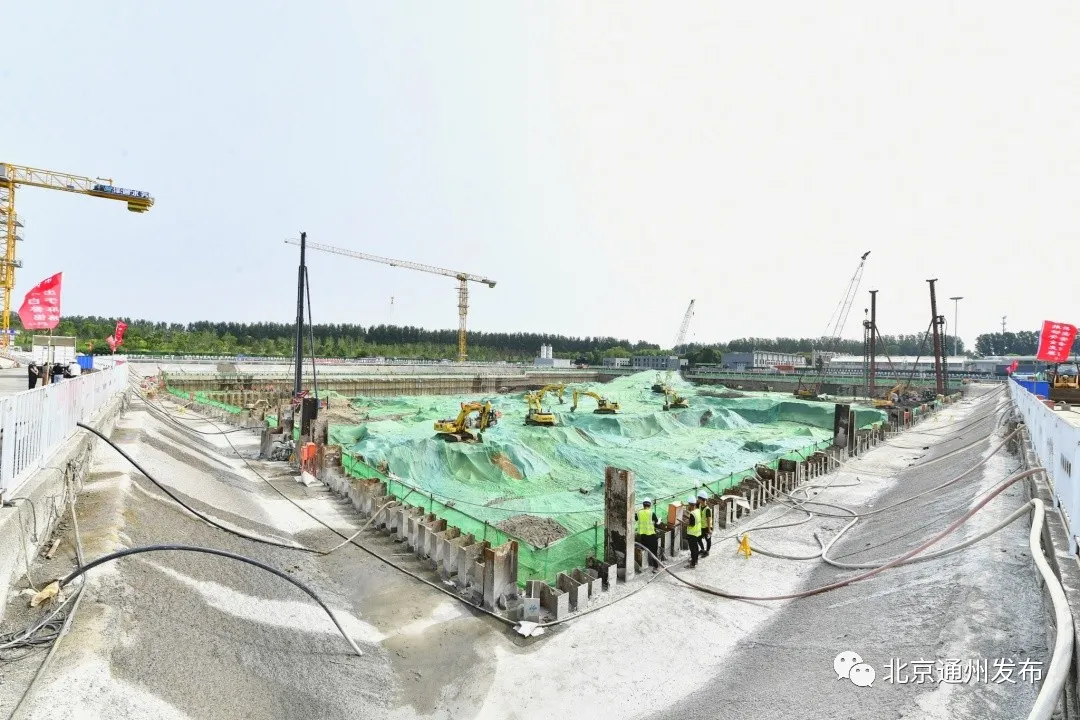 近日,位于北运河以东的河东再生水厂内施工现场,一座最深达16米的基坑已被绿色苫布包裹,可有效防止扬尘。目前正进行土石方作业、竖向结构施工。