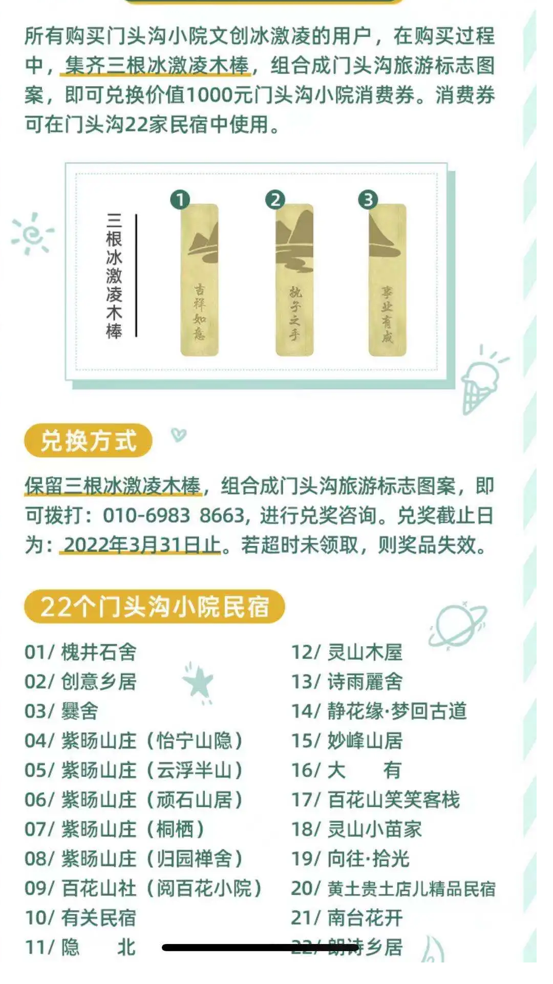 北京京西山水文化旅游投资控股有限公司副总经理张杨晨光介绍道:“采取了有奖竞买的一个活动方式,这个冰棍棍上它的图案是能拼出我们绿水青山的一个LOGO,集齐三款就可以扫码兑换一千元精品民宿消费券。我们也是希望以这个文创冰淇淋为开头, 在未来推出更多的关于精品民宿还有对门头沟区旅游发展有利的文创产品。”