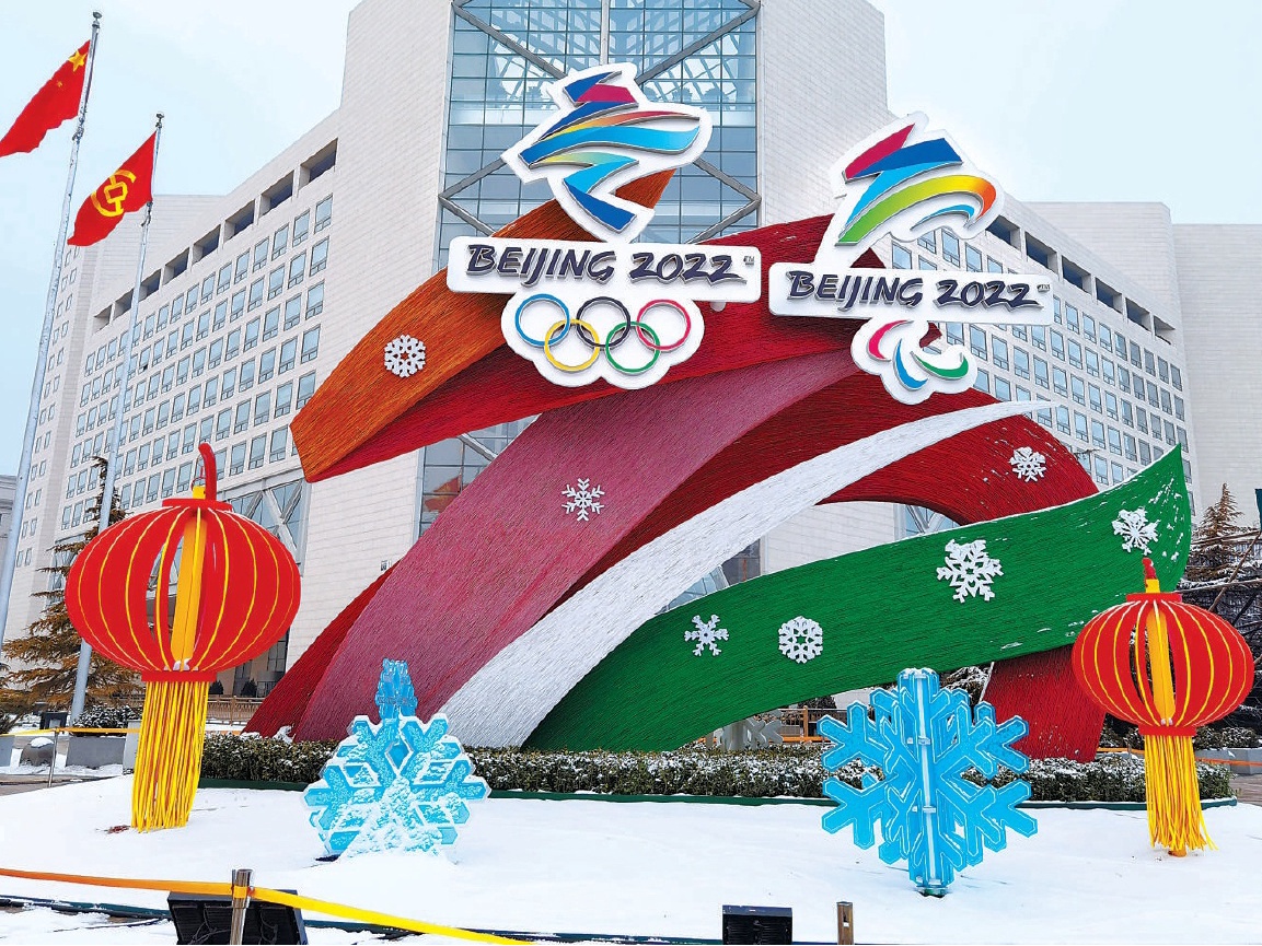 西单路口西北角“开放冬奥”主题花坛以飘舞的冬奥会和冬残奥会会徽为主景,配以丝带、雪花、灯笼等元素,体现了在奥林匹克精神感召下,世界人民携手共进、守望相助、共创美好未来。 本报记者 邓伟摄