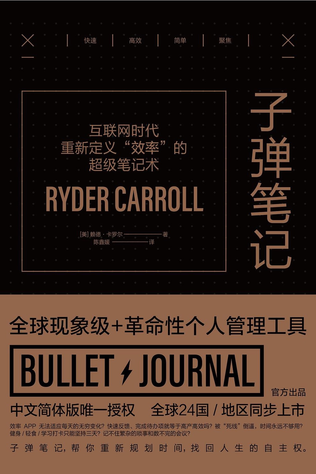 本书介绍的是子弹笔记(Bullet Journal)作为一款改变全球千万人工作、学习与生活的个人管理工具,集日程表、任务清单、规划簿、日记本的功能于一身。用“· × > <”4个图标分别代表“任务”“已完成”“已迁移”和“已计划”,利用“快速记录法”,创建每日记录、月度记录、年度记录 及个性化集子,用特殊符号区分重点及不同类别的内容,厘清重要事项,进行目标迁移,搭配日反思和夜反思整理思路,从而清晰地制订目标、规划生活、记录人生。