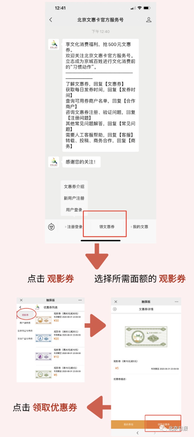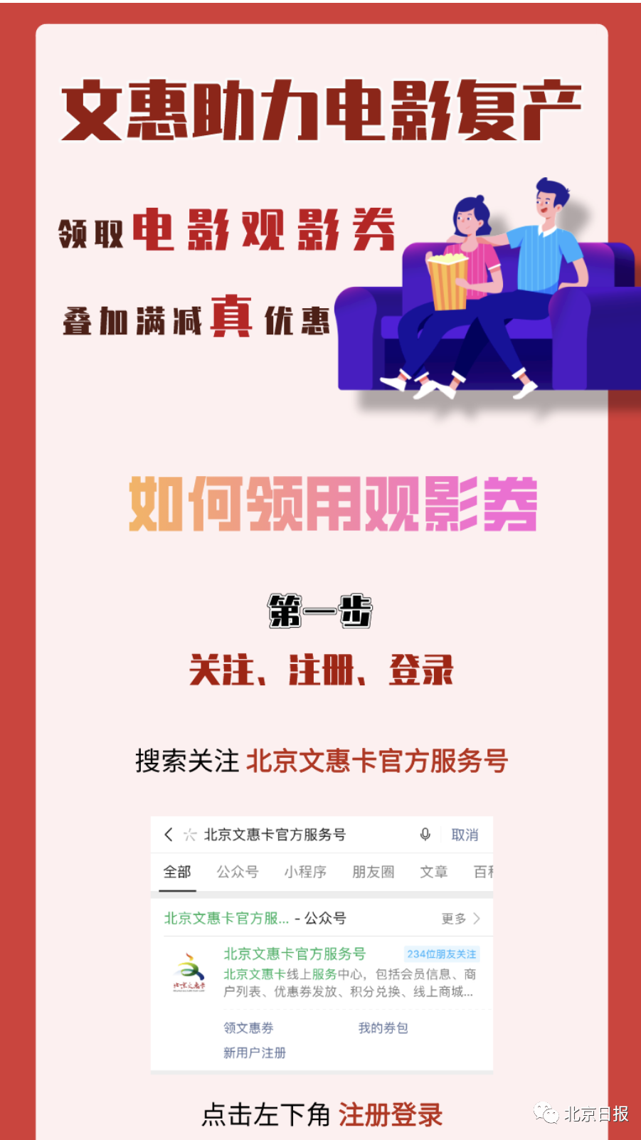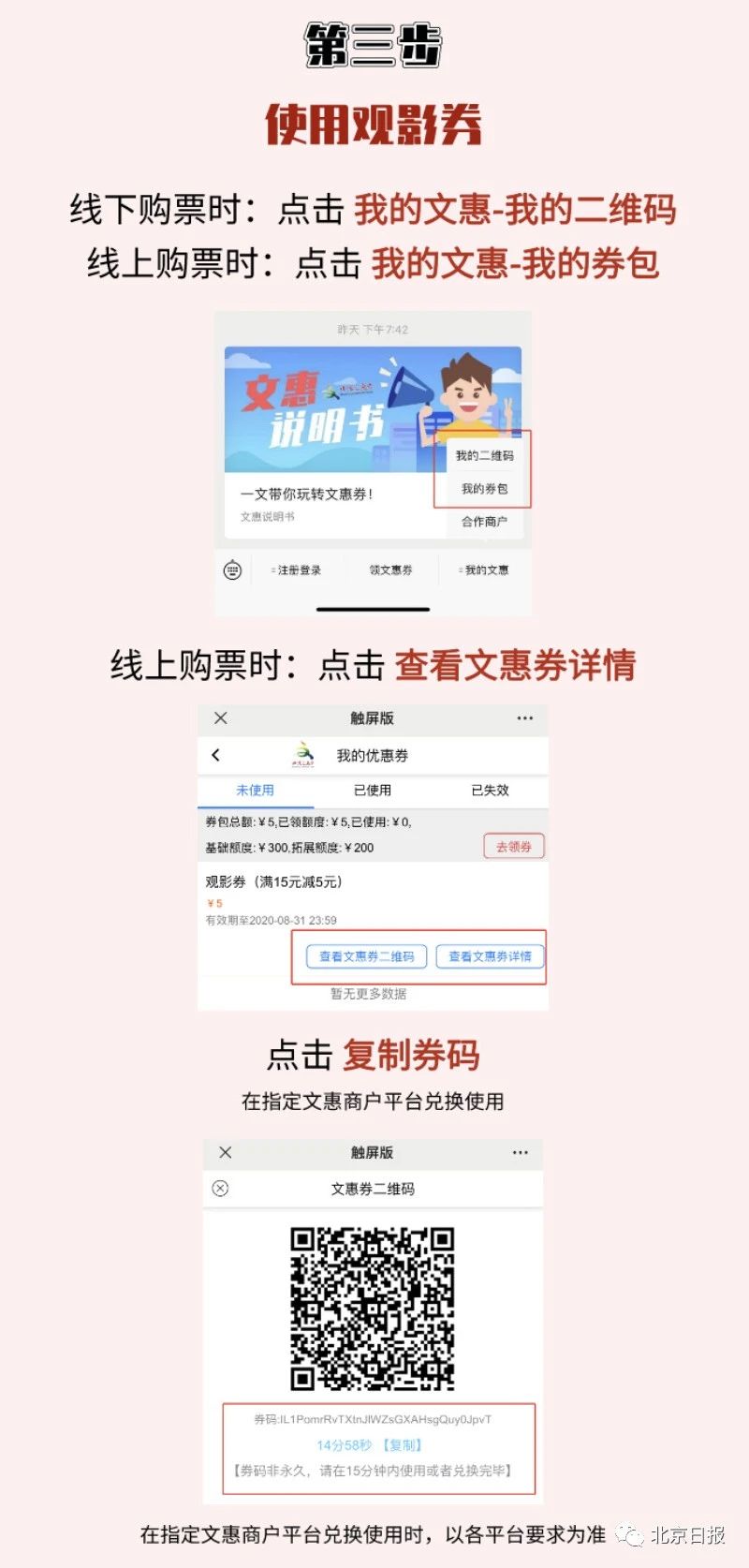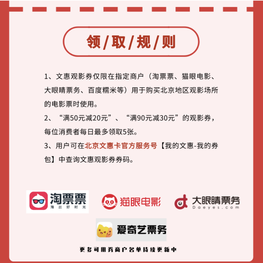 消费者可在8月22日至11月16日活动期间,在北京文惠卡官方服务号领取“观影券”,在淘票票、猫眼电影、爱奇艺票务(原百度糯米)、大眼睛票务等平台购买电影票使用。