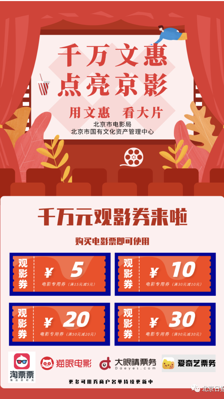 为助力电影市场复工复产,激发消费者观影热情,提振北京市电影行业复苏信心,市委宣传部、市电影局、市财政局会同市文资中心启动“千万文惠·点亮京影”主题惠民观影活动。活动将依托北京市惠民文化消费电子券项目,发放千万元“观影券”,补贴北京地区消费者电影消费。