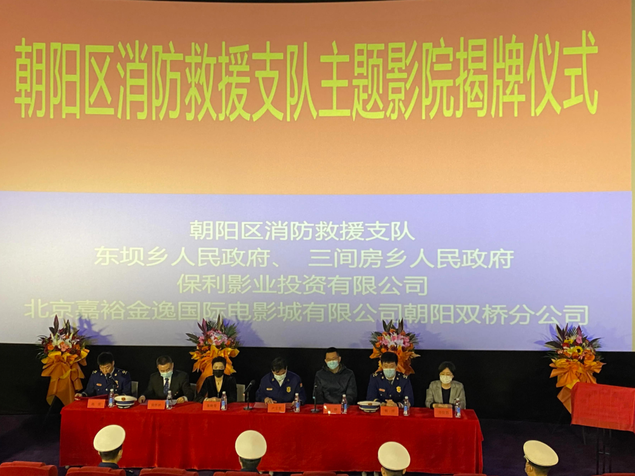 新建成揭牌的两座主题影院分别隶属于“保利”、“金逸”影业集团。昨天的揭牌仪式在东坝地区的金隅嘉品Mall商场的保利影院举行。另一家消防主题影院位于三间房地区的万达广场。此次揭牌仪式采取“线上+线下”相结合的方式进行,辖区消防安全重点单位通过视频直播全程参与观看仪式。