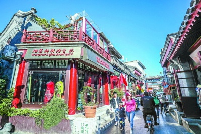 什刹海东北侧的烟袋斜街内,游客在富有传统韵味的街巷观光游览。