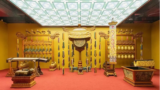 所以在此次展览中,故宫还将展出古代最高规格的皇家乐团——中和韶乐,并甄选了最有特色的6类作复原陈列,包括编钟、编磬、建鼓、柷(音祝)、敔(音语)、麾(音辉)等,气势恢宏~