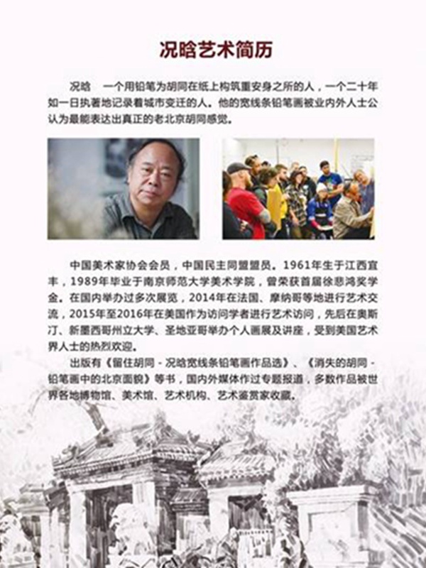 况晗老师还将在讲座中展示众多由他创作的胡同铅笔画。现场的观众将有机会亲眼看到况晗老师的原画。况晗老师用他特有的创作形式,带领观众从他笔下的门楼、房舍、街景等日常景物中感受平凡生活的诗意,体会北京浓厚的历史文化感。
