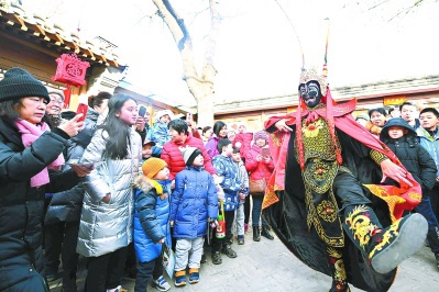 昨天,东城区朝阳门街道史家胡同博物馆里举行小年文化庙会,传统艺人们现场表演“变脸”,吸引孩子们好奇围观。