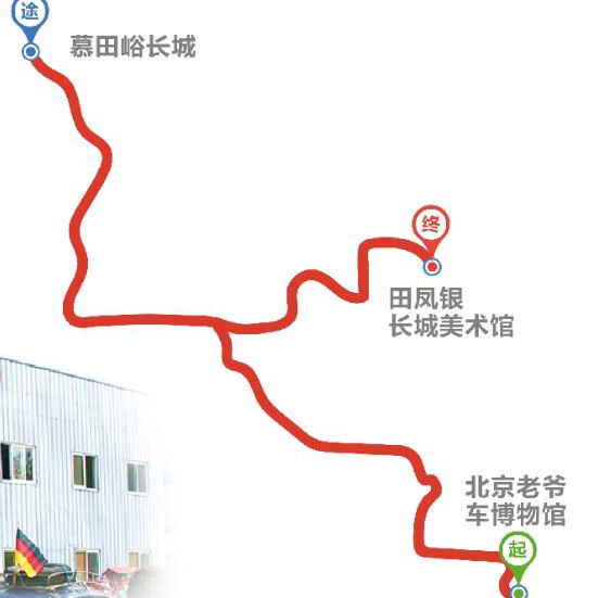自驾路线:北六环入口(G6方向)—大广高速——杨雁路—北京老爷车博物馆—慕田峪路—慕田峪长城—雁栖湖西路—田凤银长城美术馆