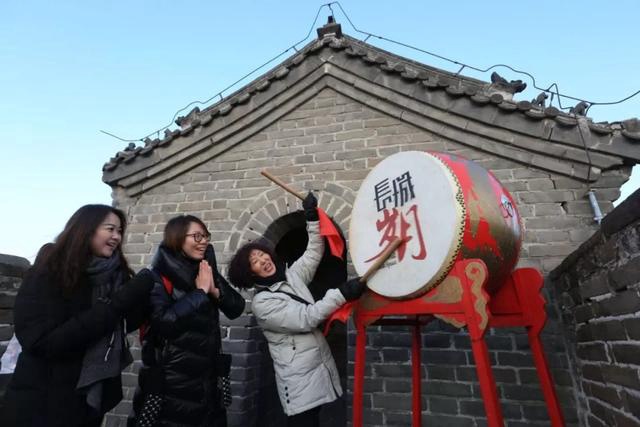 阵阵鼓声在长城上回荡,游客们敲击着新春大鼓,喜贺新年。