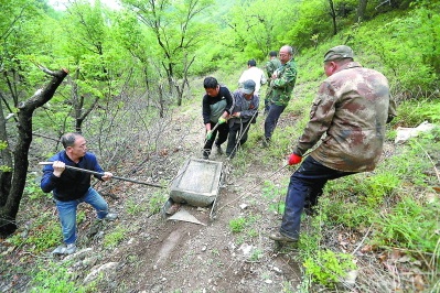5月9日,怀柔区文物所挑选经验丰富的工人,组成7人搬运小组,还专门为石碑“量体裁衣”焊制了“铁板车”,早上7点就开始上山“打道”,在陡峭的山体上沿着水道平整出一条小路,7个人有的负责在前面拖拽并掌握方向,有的在两侧用长撬保护防止侧翻,有的在后面拖拽控制节奏,前后花了近3个小时,终于把石碑安全运到山脚下。