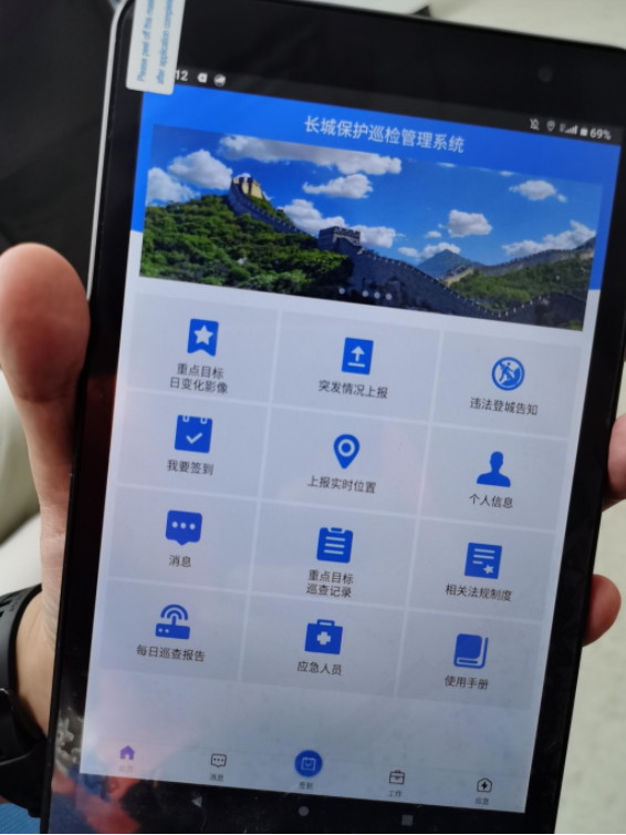 “保护员尽量劝说非法登城人员点击‘允许’。这有两方面的作用。”沈巍说。点击“允许”后,违法登城人员的手机号码会自动传到保护系统的后台,一方面执法人员可以据此追责;另一方面,如果非法登城人员不听劝阻执意要上长城,万一发生危险,便于第一时间确认位置信息,及时进行救援。因此,每位长城保护员的长城巡检仪,同时具备了违登长城“执法仪”的功能。
