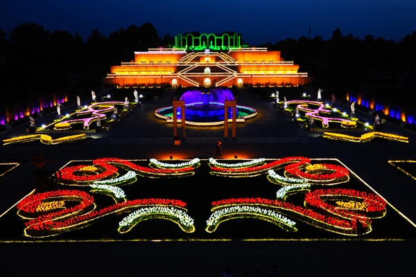 意大利台地园庭院式建筑群内,3500余平米,近万支,由红、黄、白、粉颜色搭配设计的郁金香霓焕灯阵点亮夜空。台地园上,创意设计的流星灯,倾泻而下。焕彩霓光环绕的喷水池,梦幻般地发散着斑斓的色彩。大门欧洲城堡顶端的激光灯,仰射璀璨的星空。由红、黄、蓝、白、粉颜色玫瑰花混搭设计的炫焕玫瑰园,让欧洲区充满神秘而浪漫的气息。主环路上南北两条条时光隧道,将人们引向一个“火树银花”的非遗世界。在万余朵郁金香灯花的照耀,焕发出“若非群玉山头见,会向瑶台月下逢”的意境。