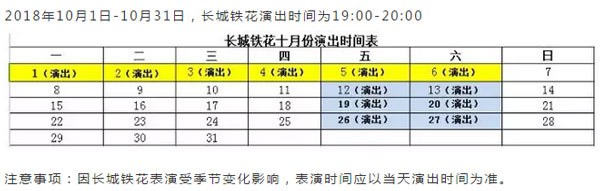 国庆节到来之际,礼炮声声震天下,五星红旗似彩霞。光辉历程世瞩目,神州大地遍地花。10月1日—10月6日连续六天,长城铁花将为大家带来精彩表演!