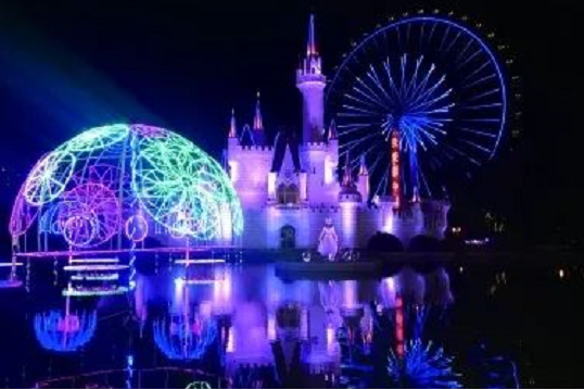 色彩绚丽的“梦想之星”摩天轮与浪漫游乐园、爱恋丛林、浪漫美人鱼、奇幻城堡、出水芙蓉、蓝桥动感光影长廊、星空之吻等20余组奇妙灯光场景互相映衬,与京西五环上川流不息的车流构成了一幅动感图景。(供图/石景山游乐园)