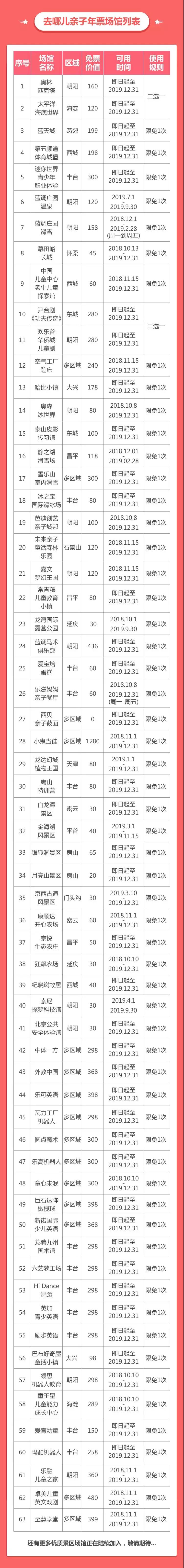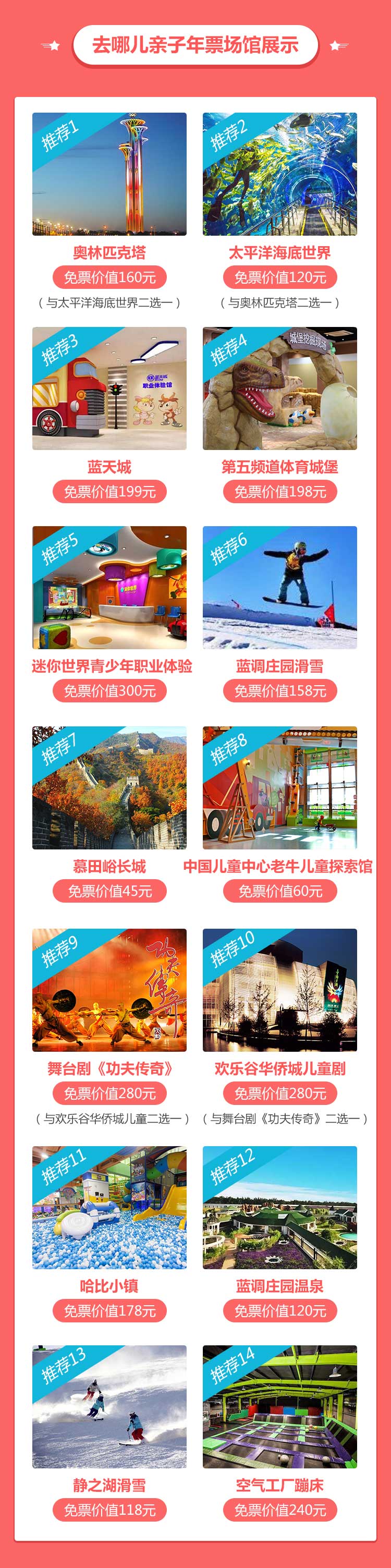 项目包含七大类别:冰雪世界、儿童乐园、休闲娱乐、自然风光、农场采摘、博物科普、教育培养,共计65家场馆!