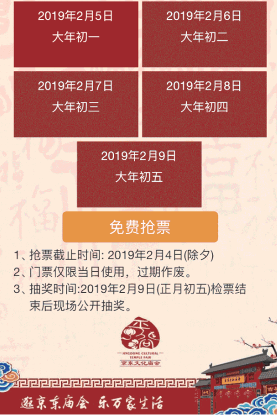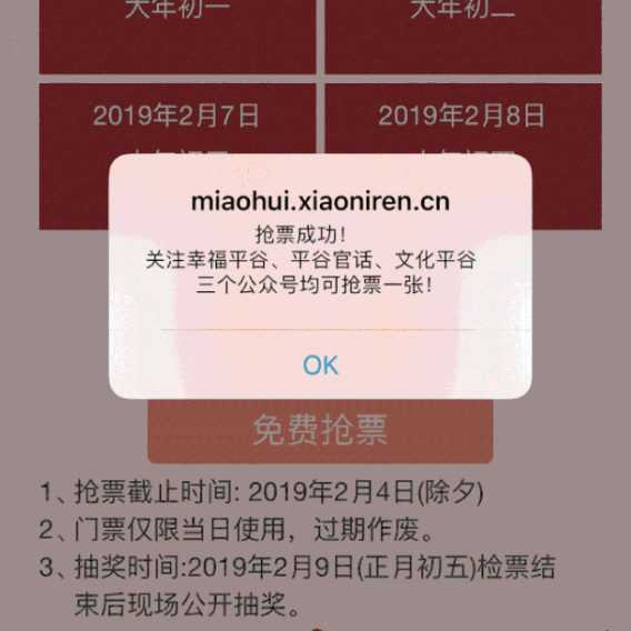 怎么样?是不是对咱们这次的庙会充满了期待呢,下面重点来啦!!小编教您怎么抢票按照下面的步骤,点击菜单进入我要抢票页面,可以选择相应的日期进行领票,领取成功后弹出“领票成功”对话框,并且跳转至门票二维码。