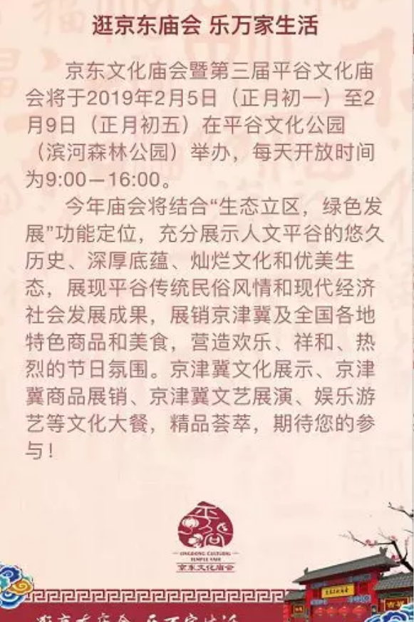 携手京津冀,文化闹新春第三届平谷文化庙会将于2019年2月5日(正月初一)至2月9日(正月初五)在平谷文化公园(滨河森林公园)举办。每天开放时间为9:00—16:00,今年庙会将结合“生态立区,绿色发展”功能定位,突出京津冀三地协同,传承“我们的节日——春节”,充分展示平谷历史文化底蕴,传统民俗风情,经济社会发展成果,举办京津冀书画影联展、京津冀商品展销、京津冀特色美食展卖、京津冀非遗展示互动、童趣娱乐游艺、提琴文化展演、大桃文化展销、精品文艺演出、冰雪娱乐和书法“万福送万家”等主题活动。