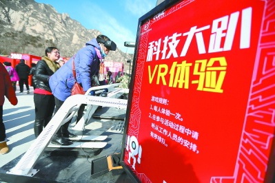 昨天,一名游客在凤凰岭新春游园会上体验VR炫酷互动游戏“高山滑雪”。